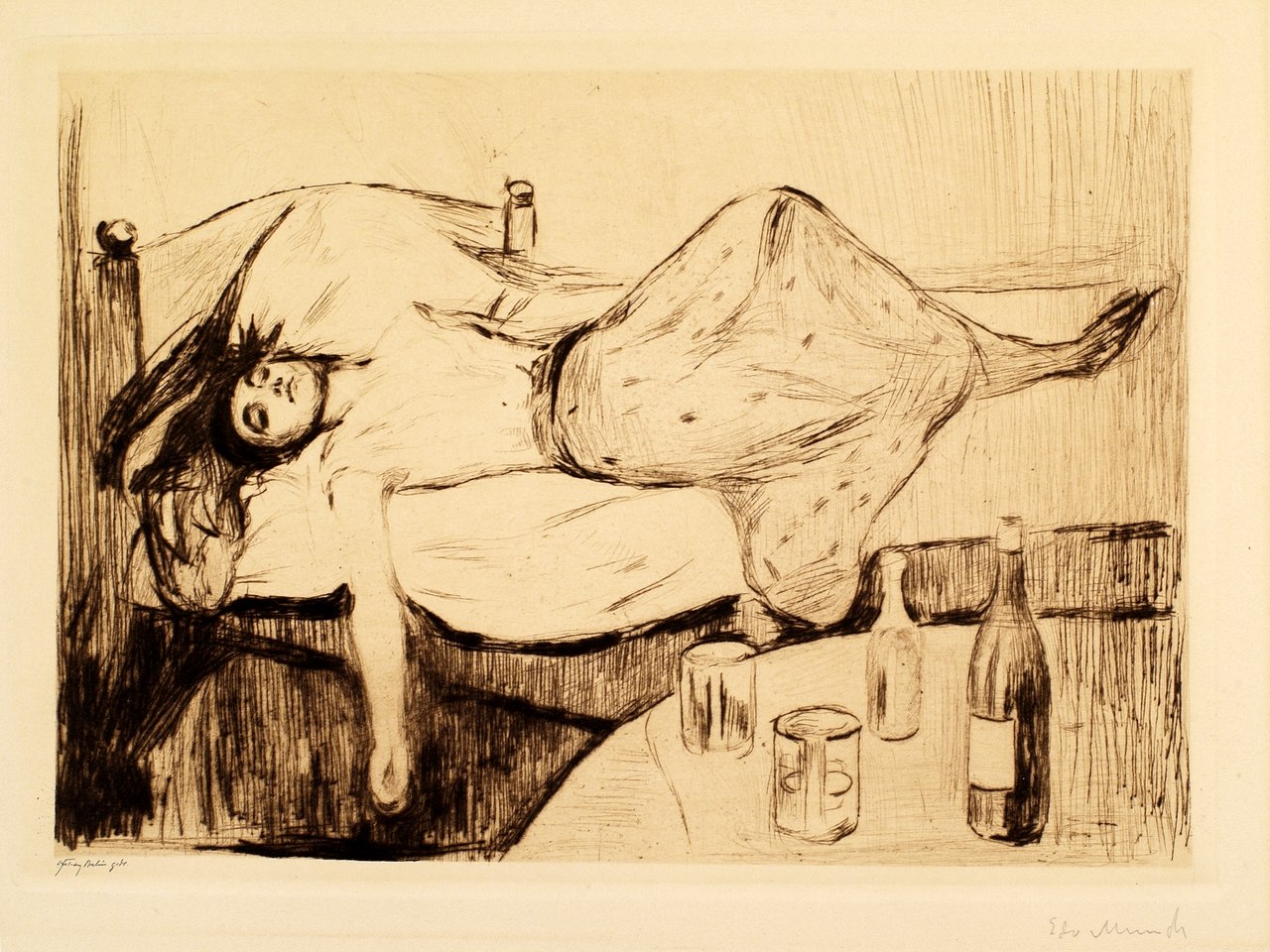 Les stries sur le tableau figurent les pleurs du peintre et provoquèrent l'incompréhension du public de l'époque. Très tôt dans son oeuvre, Munch est frappé par le malheur familial. Ce tableau représente sa soeur