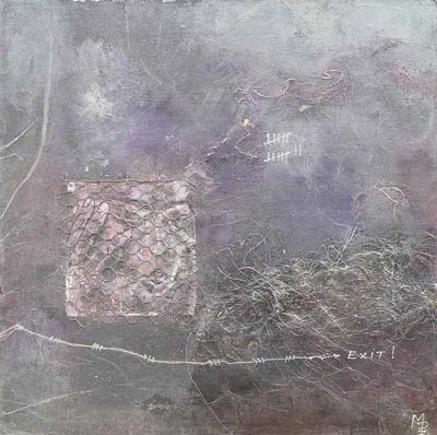 MP : Comme peinture, depuis 2002, je n'utilise que de l'acrylique. J’utilise aussi différents médiums, du gel de structure et à peu près, tout ce que je trouve d’intéressant comme produit de récupération : ficelles, tissus, papiers, grillage, métal, bois, cartons etc… (cf. Des racines sans les ailes, Matière à …). Depuis quelques mois, je mêle ceux-ci à des encres détournées (cf. série : Mes petites encres et plus).