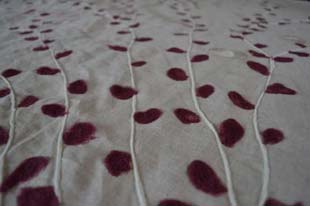 VA : Parfois j'ai une idée en dormant et puis le matin je me lance. D'autres fois je pars d'un carré de tissu que je pose par terre, je le regarde, je marche autour, je fais un croquis à la craie, je l'efface, je positionne des laines différentes... En ce moment je peins, c'est à dire que j'utilise de la peinture que je pose sur le tissu. Je fais aussi du feutrage. C'est un mélange de techniques et aussi de matières premières. Je n'utilise que des matériaux naturels, bruts et puissants.