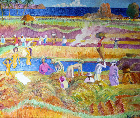 Ce que j'aime dans ce tableau (Moisson, Pierre Dalmas), c'est que certains moissonnent, alors que d'autres se baignent. Idée de peinture géniale (moisson orientale).